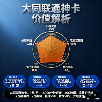 大同自由职业者看!联通神卡8元/月,18000分钟跟客户聊方案、40G流量剪视频传文件,流量用不完留着下月用!远程过户以后账号交接也方便,加微信910336,省钱又省心!