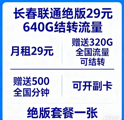 长春小伙伴注意啦!专属你的流量通话自由已上线:联通绝版29元套餐,320G全国流量可结转(等效640G),500分钟全国通话任性打,支持副卡办理,全家共享更划算,远程/营业厅过户灵活选。