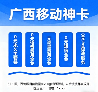 广西移动神卡横空出世!0元锁定永久主套餐,语音通话无费用、流量畅用不花钱、短信发送全免费,5G极速体验0元解锁~ 特别告知:广西地区目前流量200G封顶,后续将逐步放开限制,价格1xxxx,错过再等N年!