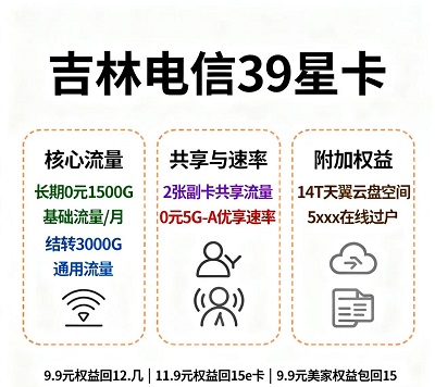 吉林电信39星卡的隐藏福利太香了!39元月租不仅含3000G流量,还直接送0元5G - A优享速率,下载速度秒级加载,刷4K视频不缓冲、玩大型手游不卡顿、视频通话无延迟,不管是日常使用还是办公需求,高速体验拉满!更有14T天翼云盘免费送,照片、视频、工作文件随便存,不用担心手机内存不够,家庭影像、办公资料一站式备份,安全又便捷!网速+存储双高配,39元花得值回票价,吉林人这波不亏!